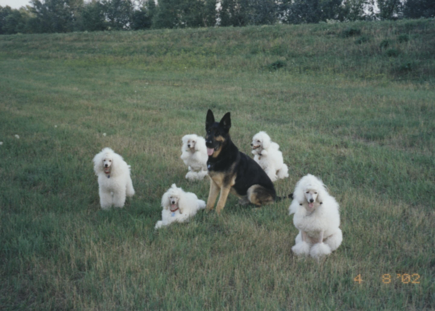 Janka so svojimi pudlíkmi, v náručí drží svojho prvého Amiska, vľavo dole je Sisinka, v strede Aluetka a na pravo Deyssinka.